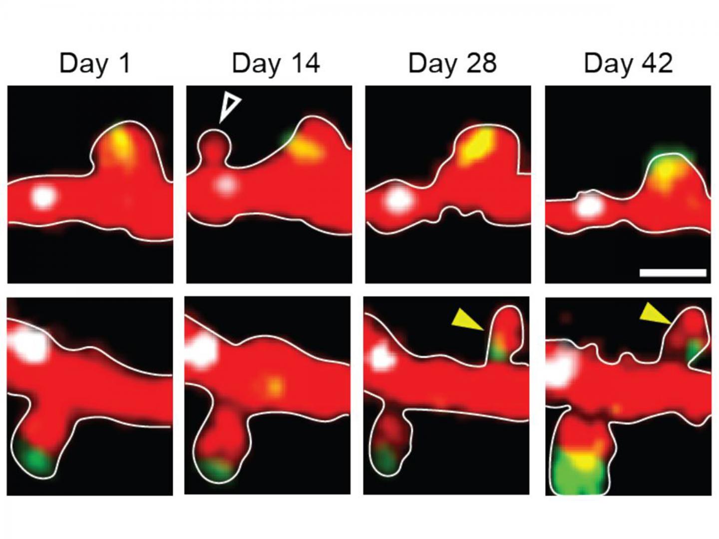 image: Top row: A dendritic spine comes and goes around Day 14. Bottom row: a different spine becomes permanent after about four weeks.
