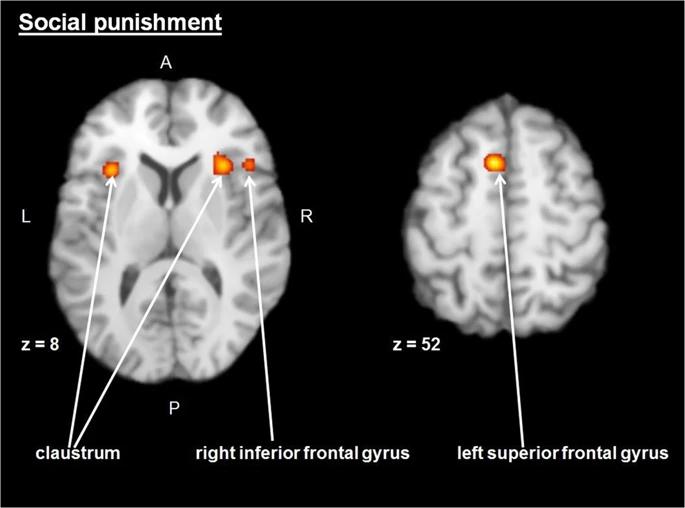 The analysis revealed that such areas of the brain as the bilateral claustrum (upon activation, spreading to the insular cortex), the left superior frontal and right interior frontal gyri were always activated for social punishment tasks. These areas related to either the salience network or central-executive network of the brain. These neuron systems are responsible for focusing attention, detecting errors, and processing contextual information - all essential components for punishment decision-making. The right interior frontal gyrus is regarded as a key region in the brain's 'emotional empathy network', required for adequate responses to various social interactions. As for the left superior frontal gyrus, its main function is believed to store information in the working memory during decision-making processes.