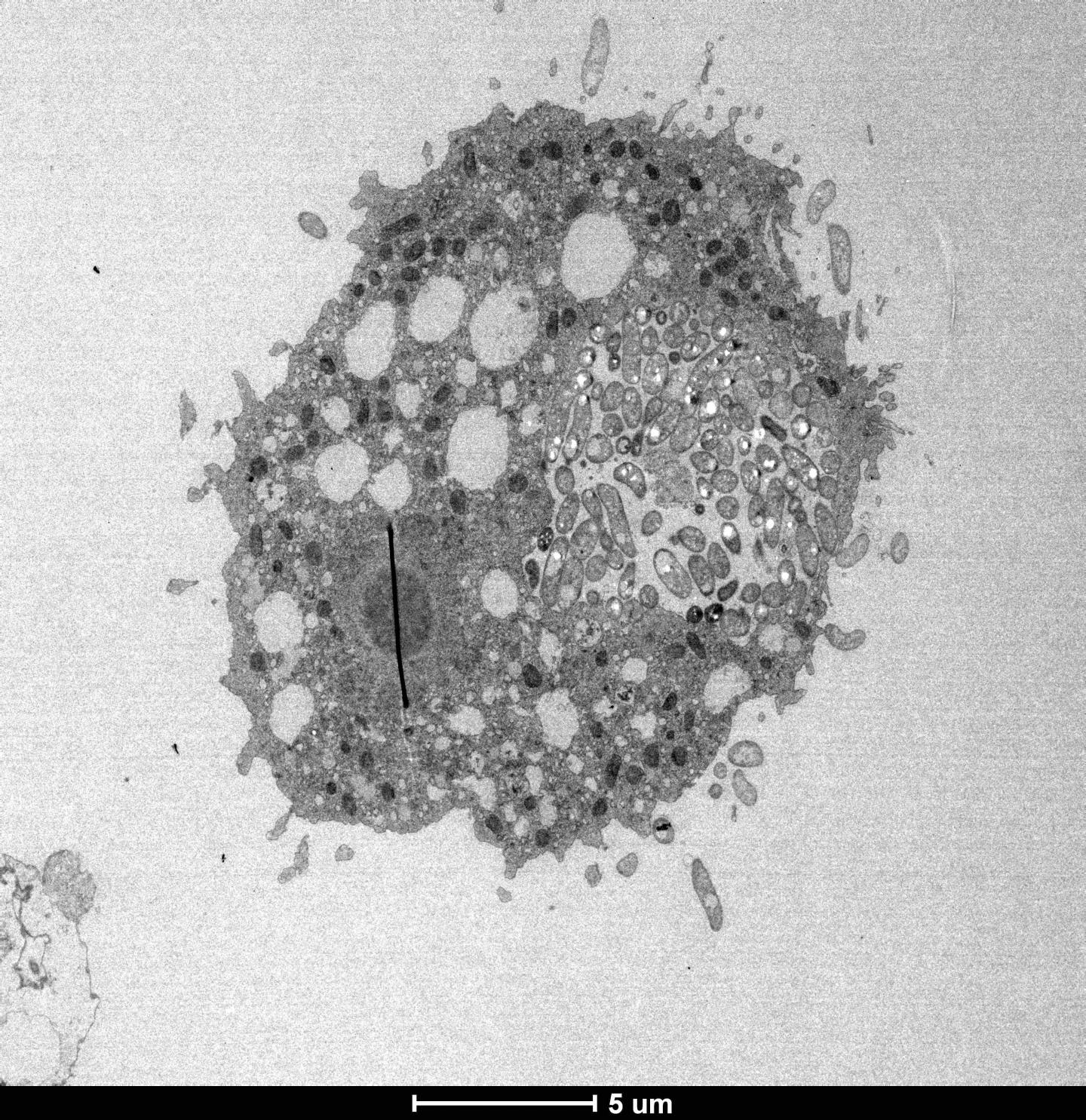 image: Electron micrograph of the cholera-causing pathogen inside an aquatic amoeba.