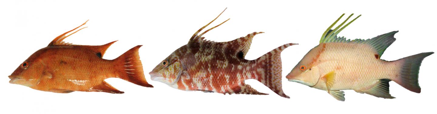 image: A pointy-snouted reef fish called the hogfish can change from white to spotted brown to reddish depending on its surroundings.