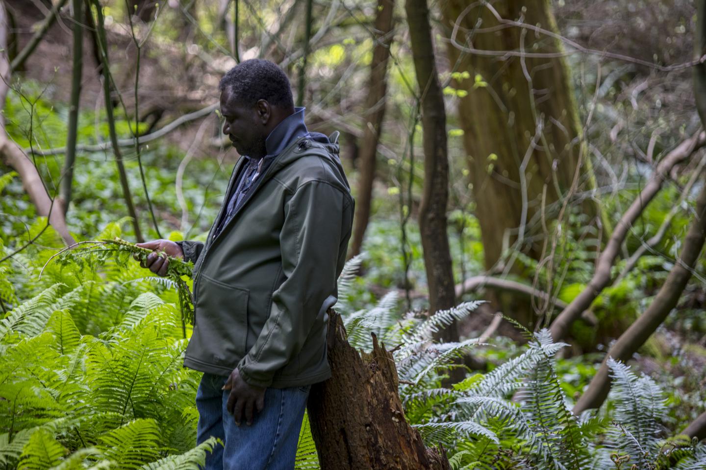 image: A man examines a fern and other plants within Washington Park Arboretum in Seattle, Washington.