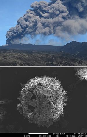 image: Volcanic plume associated with the April-May 2010 eruption of Eyjafjallajökull volcano (Iceland) and Scanning Electron Microscope image of a typical ash cluster made of micrometric volcanic particles collected on an adhesive paper during fallout.