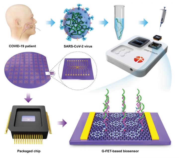 Recently, Guo and coworkers from Peking University developed an unprecedented accurate, rapid, and portable electrical detector based on the use of graphene field-effect transistors (G-FETs) for detection of RNA from COVID-19 patients. As shown in Fig. 1, the detection system mainly consists of two parts: a plug-and-play packaged biosensor chip and a home-developed electrical measurement machine. The unique feature of this method is that the extent of hybridization between the ss-DNA probe and viral RNA can be directly converted to the current change of graphene channels without repetition of the PCR process, thus affording an ultra-low limit of detection (LOD) of ?0.1 fg/mL for the detection of the RNA-dependent RNA polymerase (RdRp) gene target of SARS-CoV-2. Furthermore, this method was validated using clinical samples collected from many patients with COVID-19 infection and healthy individuals as well, and the testing results were in full agreement with those of PCR-based optical methods. The entire process, precluding the extraction of detection targets from oropharyngeal swabs, requires approximately 10 min. Because it does not involve time-consuming PCR step nor expensive instruments, this detection system enables massive point-of-care testing of COVID-19, outside of specialized diagnostic laboratories, with the advantage of high accuracy, sensitivity and low cost.