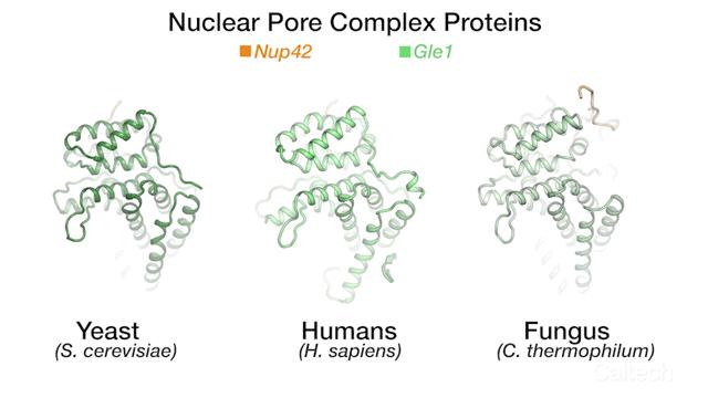 The team's new findings were made possible by obtaining a series of crystal structures of a few key protein components of a human NPC. One of those components is called Gle1. The three-dimensional structure of this protein had been obtained before in yeast, but doing so for its human variant had remained a challenge. By studying the biochemical properties of yeast Gle1, the researchers were able to figure out that another protein, called Nup42, was required to stabilize Gle1. Knowing this, the team was able to purify human Gle1 from cells in high quantities for the first time, and then, using Caltech's Molecular Observatory beamline at the Stanford Synchrotron Radiation Lightsource, obtain its crystal structure.