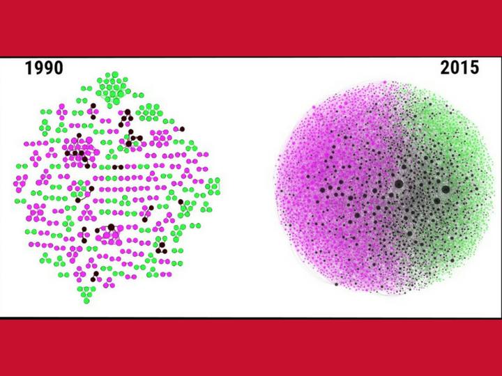 image: Evolution of the collaboration network in the biology-computing college in the United States from 1990 (pre Human Genome Project era) to 2015. Links represent co-authorship relationships. Green nodes denote biology faculty, magenta nodes denote computing faculty, and black nodes denote faculty from either discipline involved in cross-disciplinary genomics work. The size of the nodes suggest the centrality of the faculty in the network.