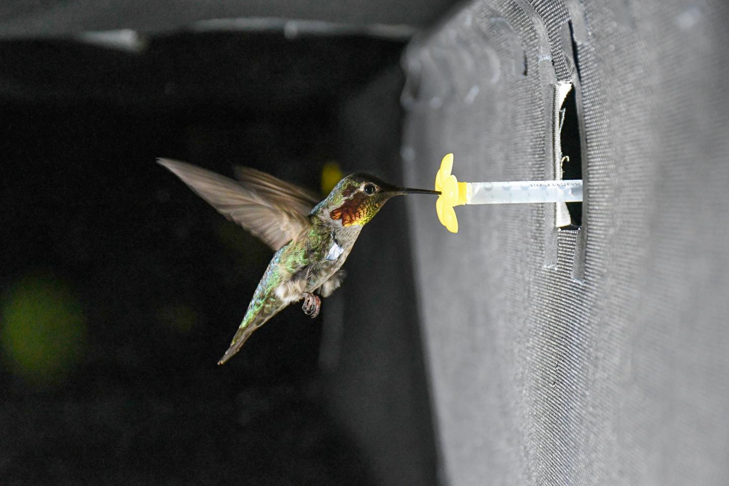 To arrive at their model, the scientists examined six Anna's hummingbirds, the most common species around Stanford. One by one, they had the birds drink sugar water from a fake flower in a special flight chamber. Around the chamber, not visible to the bird, cameras, microphones and pressure sensors were set up to precisely record each wingbeat while hovering in front of the flower.