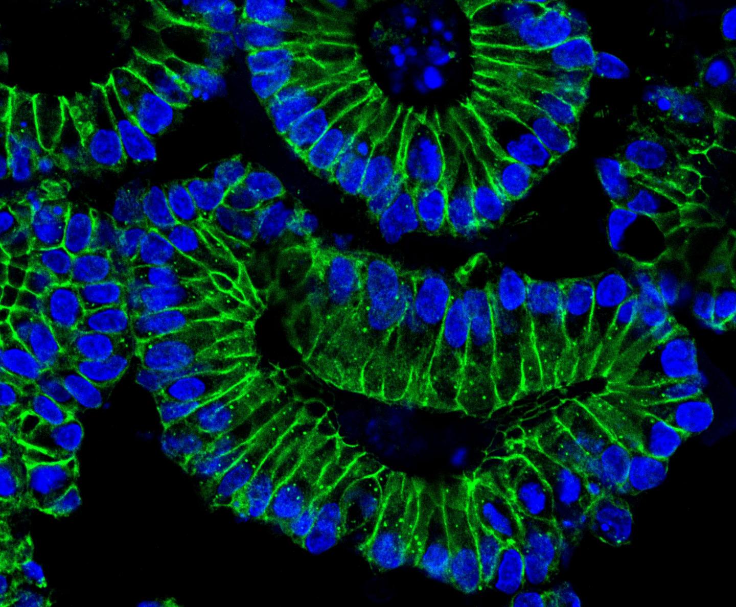 image: Intestinal organoids: After treatment with IFN-?, the intestinal cells differentiate. The cell nuclei (blue) of the epithelial cells (green) localize at the basal (outer) edge of the organoids. This is accompanied by an increased production of the ACE2 receptor, which SARS-CoV-2 uses as a port of entry into the cells.