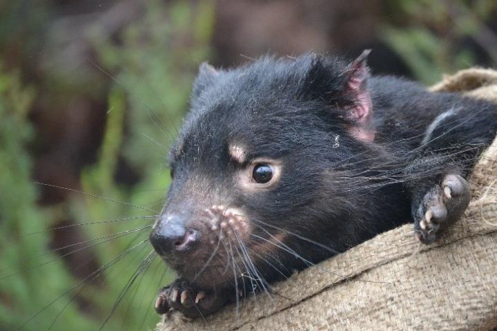 image: A young Tasmanian devil. Tasmanian devils are endangered by devil facial tumour 1 (DFT1), a transmissible cancer.