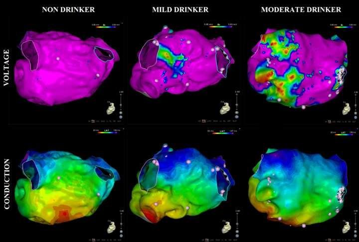 image: Representative high-density voltage (top panel) and propagation maps (bottom panel) of the posterior left atrium for non-drinkers, mild drinkers, and moderate drinkers. The moderate drinker has more scarring evident.