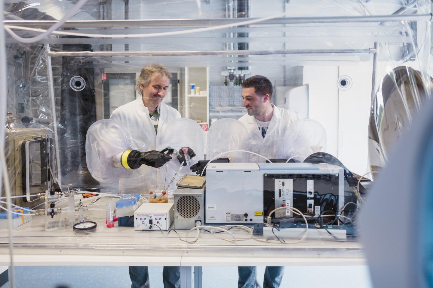 image: Thomas Happe (left) and Oliver Lampret aim at understanding the workings of hydrogen producing enzymes in detail.