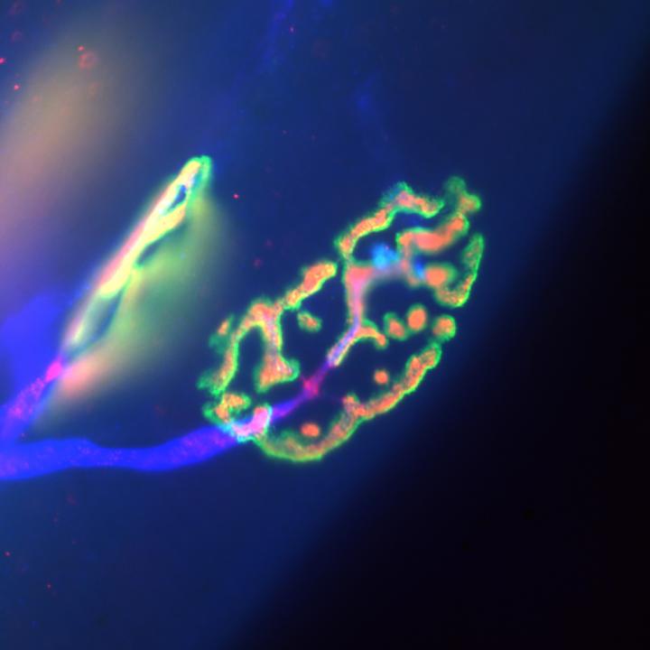 image: Proper neuromuscular junction: The nerve (blue) and its presynaptic nerve terminal (red) with the postsynaptic receptors in the skeletal muscle (green).