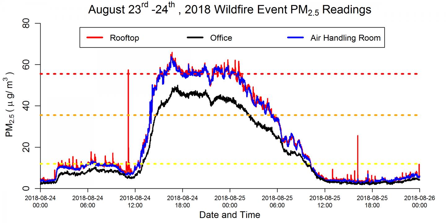 image: Minute-by-minute outdoor and indoor air particulate matter measurements during an August 2018 wildfire event.