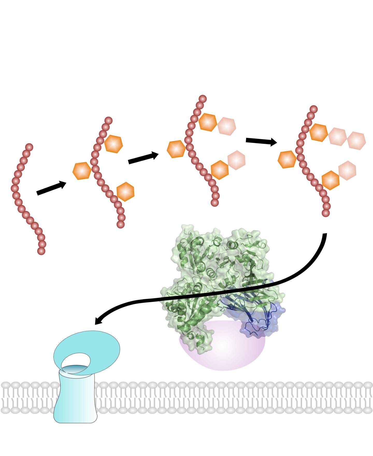 Yu Chen, at the time a postdoctoral research associate in Rapoport's lab, led the investigation. She found that, in order to be transported, the adhesin protein needed to be modified with specific sugars by three enzymes acting in a specific sequence. These sugar modifications stabilize the protein and enhance its stickiness to target cells. Furthermore, the experiments showed that two proteins in the adhesin-specific pathway, whose function had previously been mysterious, seemed to be able to bind to these sugars, presumably enabling them to carry the adhesin to the cell membrane where adhesin's dedicated exit channel is located.