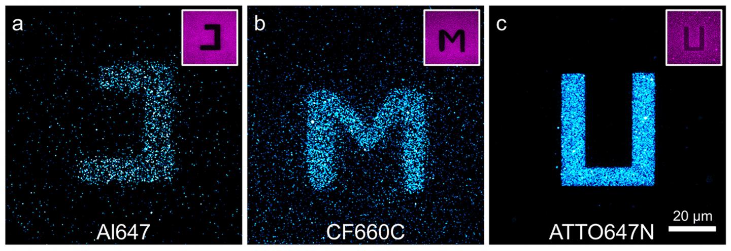 image: Confocal fluorescence images of glass surfaces coated with the cyanine dyes Alexa Fluor 647 (a) and CF660C (b) and with carborhodamine dye ATTO647N (c) after light excitation at 568 nanometres (nm). By exciting the red-absorbing dyes at 640 nm in certain areas (negative images top right), dyes are photoconverted there and it is possible to write letters on the surface that were excited at 568 nm and fluoresce at about 580 nm. The carborhodamine dye shows more efficient photobluing than the cyanine dyes.