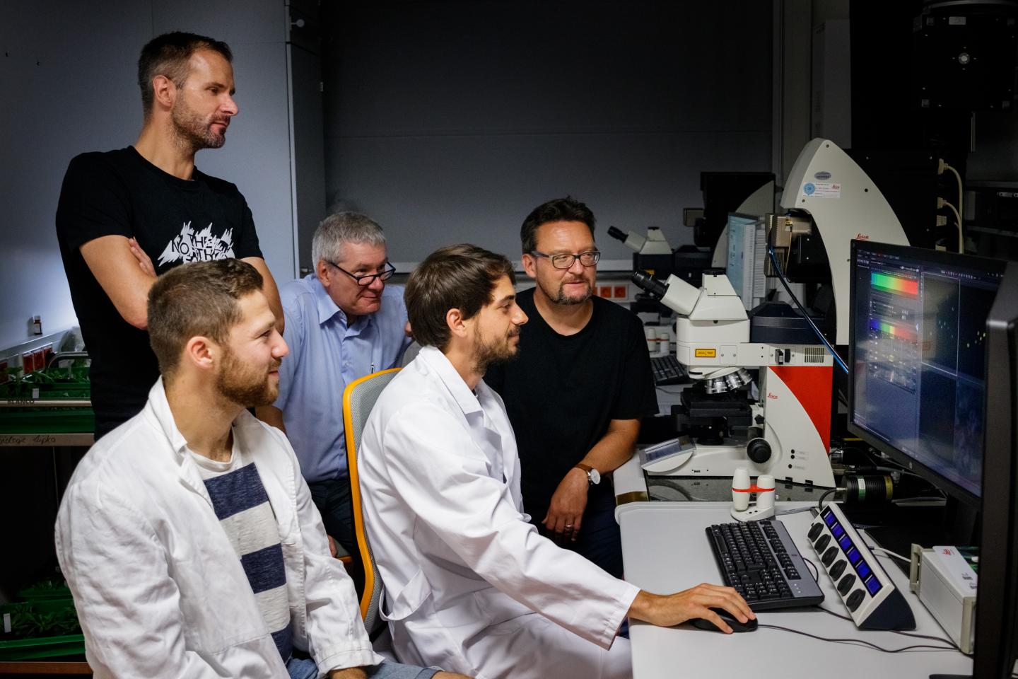 image: Daniel Lüdke shows his colleagues the results of the microscopic examination.