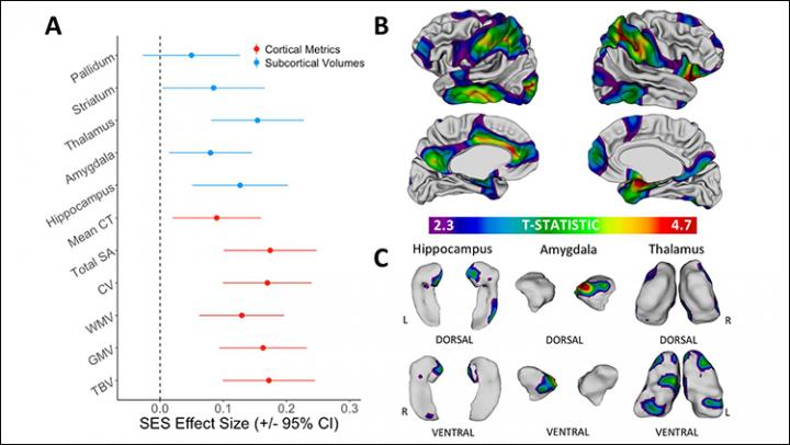 Cassidy McDermott, Armin Raznahan, and colleagues analyzed brain scans of the same individuals collected over time between five and 25 years of age. Comparing this data to parental education and occupation and each participants' intelligence quotient (IQ) allowed the researchers to demonstrate positive associations between SES and the size and surface area of brain regions involved in cognitive functions such as learning, language, and emotions. In particular, this is the first study to associate greater childhood SES with larger volumes of two subcortical regions - the thalamus and striatum - thereby extending previous SES research that has focused on its relationship to the cortex. Finally, the researchers identify brain regions underlying the relationship between SES and IQ. A better understanding of these relationships could clarify the processes by which SES becomes associated with a range of life outcomes, and ultimately inform efforts to minimize SES-related variation in health and achievement.