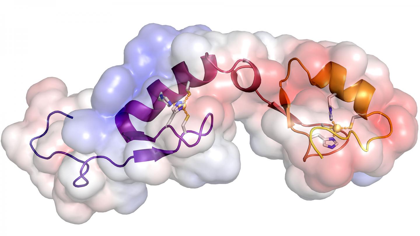 image: This is a structure of the Asterix/Gtsf1 protein. Asterix/Gtsf1 helps immobilize so-called "jumping genes" in germ cells, a type of cell important for sexual reproduction. CSHL Professor & HHMI Investigator Leemor Joshua-Tor and a research investigator in her lab, Jonathan Ipsaro, used two different biophysical techniques, cryo-EM and NMR, to develop their model. In this NMR structure, the purple helix binds to a tRNA, a special class of RNA, which is speculated to escort it to a jumping gene. The blue surface of the protein is positively charged, which helps it bind to negatively charged RNA molecules. The red area on the right is negatively charged.