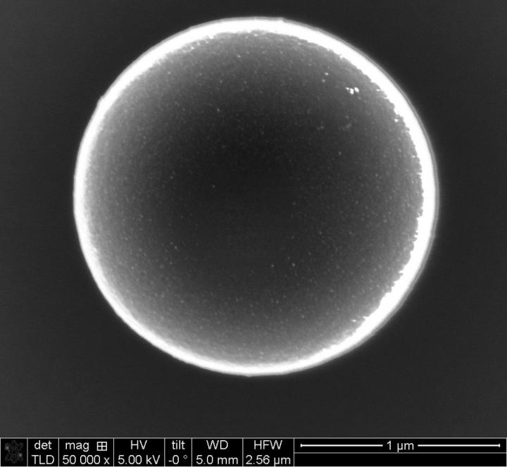 image: Electron microscope image of a microswimmer. The particle is 2.18 micrometres in diameter. The small, brighter dots on the particle are gold nanoparticles about 8 nanometres in size.