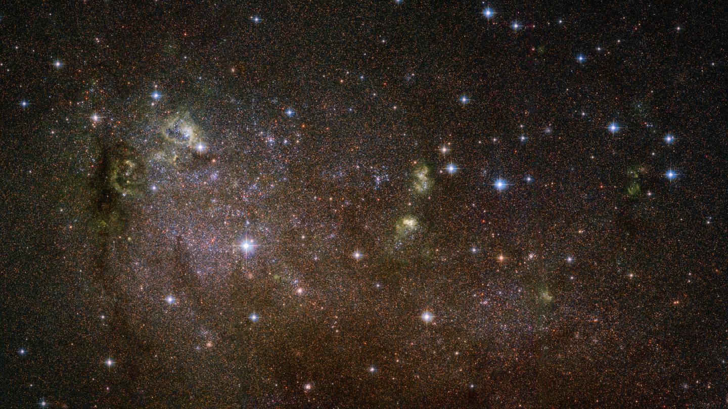 image: As an irregular galaxy, IC 10 lacks the majestic shape of spiral galaxies such as the Milky Way, or the rounded, ethereal appearance of elliptical galaxies. It is a faint object, despite its relative proximity to us of 2.2 million light-years. In fact, IC 10 only became known to humankind in 1887, when American astronomer Lewis Swift spotted it during an observing campaign. The small galaxy remains difficult to study even today, because it is located along a line-of-sight which is chock-full of cosmic dust and stars.