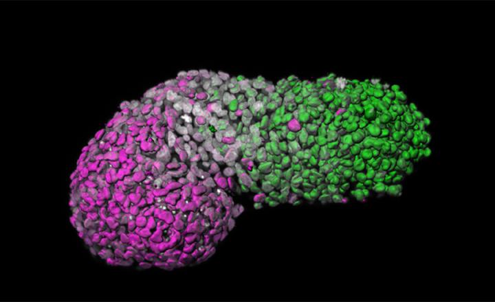 image: Image analysis of human gastruloid showing 'anteroposterior' patterning. Green is posterior part similar to tail-end of an embryo, magenta is anterior part similar to developing heart cells, grey marks DNA.