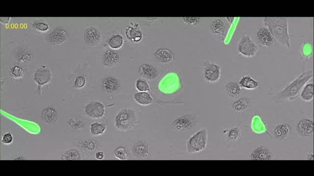video: A new study from Washington University School of Medicine in St. Louis describes a strategy that could lead to therapies for clearing HIV infection. The video clip shows human immune cells. Those glowing green are infected with HIV. An important HIV protein is normally inactive when inside the cells. But when treated with a drug that activates the protein, tripping a newly identified natural alarm system that can detect the active protein, the infected cells self-destruct. The green glow, which labels the virus, disappears as the cells collapse over several hours in this time-lapse video.