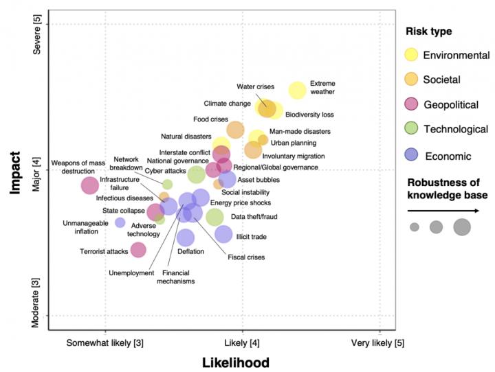image: Mean ranked likelihood and impact of global risks and robustness of the knowledge base surrounding each risk (size of the circle)