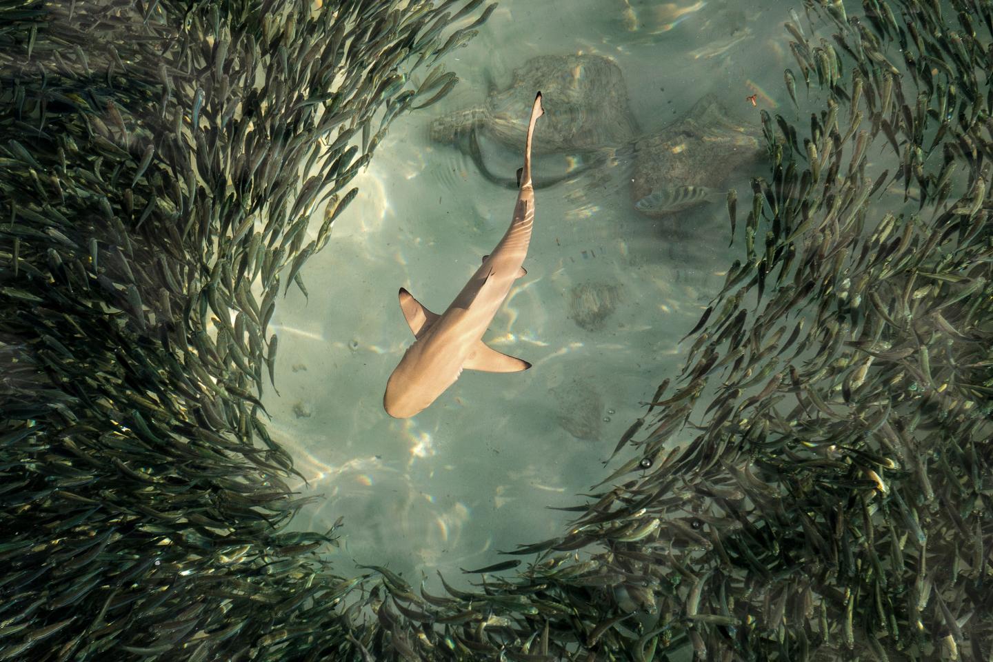 image: The risk of being caught by a predator is one of the risks that wild animals face when searching for food. Here a shoal of fish meets a blacktip reef shark.