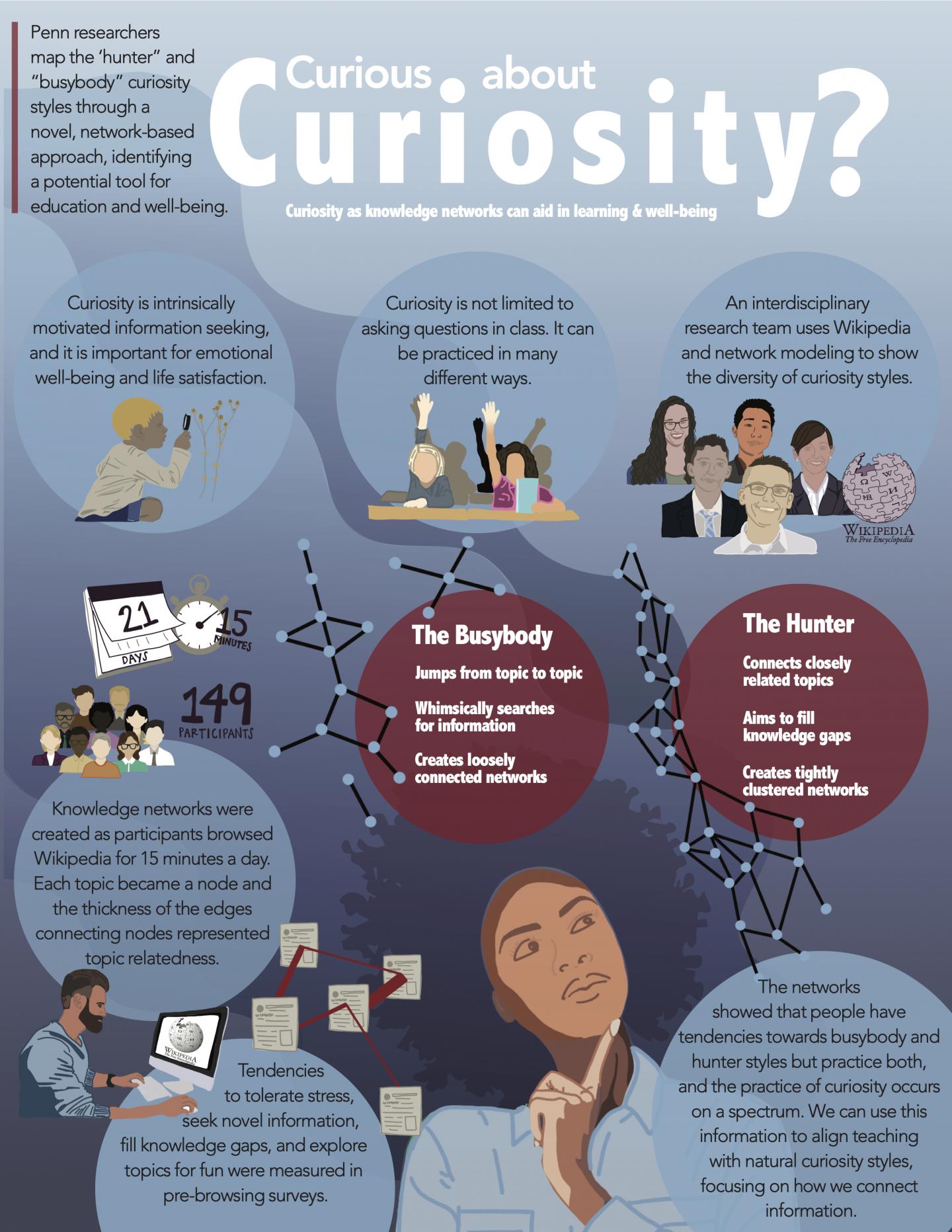 image: An infographic summarizing the team's research on mapping curiosity styles through Wikipedia browsing and graph theory. Results show that participants tend toward either a "busybody" or "hunter" style, but change throughout the day. Surveys served to link how curious practice might influence emotional well-being and vice versa. Continued research on linking the two will help elucidate new applications for mapping knowledge networks.