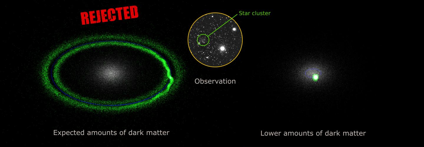Star clusters are gravitationally bound collections of stars that orbit inside galaxies. Unlike galaxies, star clusters are so dense that their stars gravitationally scatter from one another causing them to slowly expand. The research team made the key new insight when they realised that the rate of this expansion depends on the gravitational field that the star cluster orbits in and, therefore, on the distribution of dark matter in the host galaxy. The team used a large suite of computer simulations to show how the structure of star clusters is sensitive to whether dark matter is densely packed at the centre of galaxies, or more smoothly distributed. The team then applied their method to the recently discovered "ultra-faint" dwarf galaxy, Eridanus II, finding much less dark matter in its centre than many models would have predicted.