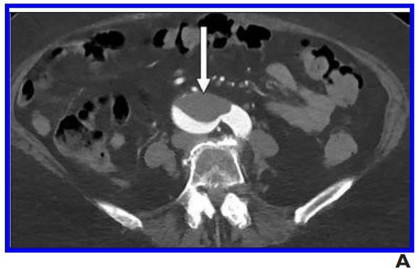 image: A, 76-year-old woman who presented to emergency department with upper back pain. Axial abdominopelvic CT angiogram shows nonocclusive acute aortic thrombus (arrow). Bilateral common iliac artery and left internal iliac artery thrombi (not shown) were also seen, as well as signs of chronic atherosclerotic disease. After findings of concurrently performed chest CT raised concerns, patient was determined to have COVID-19.