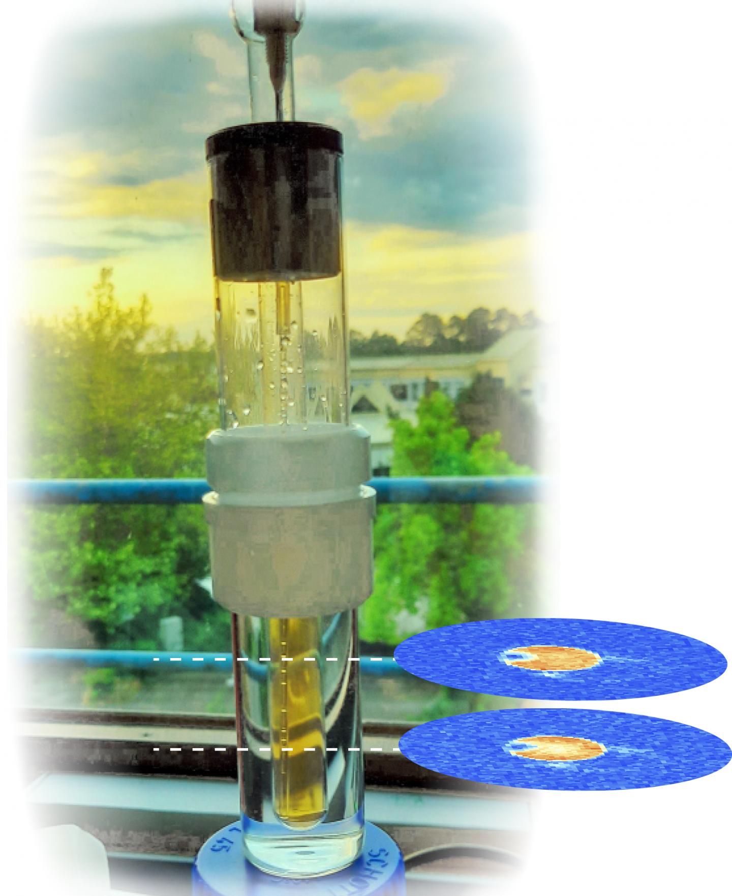 image: The phantom used for hyperpolarized imaging, with an illustration of imaging slices acquired using the new technique.