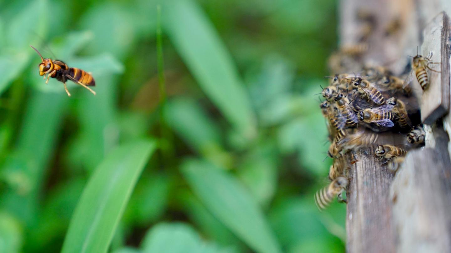 An Asian hornet sets its sights on a busy honey bee hive. If all goes according to plan, the hornet's attack will result in a haul of bee larvae, precious nourishment to pilfer and feed to its own hornet young.