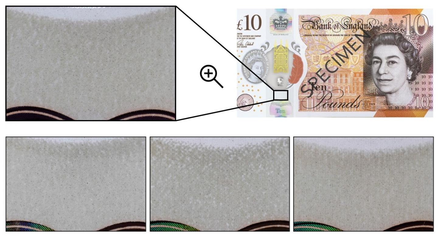 image: A demonstration of the feature area from a £10 polymer banknote (top). Three snapshots at the bottom show the random variation of the patterns for three different £10 banknotes.