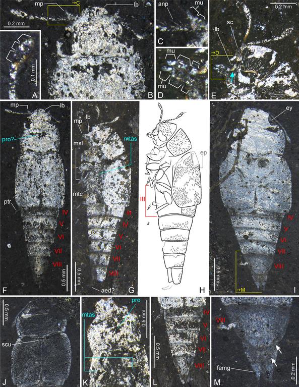 Given the hidden mandibles, distinct antennal shape, and other features, including "paratergites"--little plates on the sides of most staphylinid abdomens that are absent in Leehermania--and the shape of the female insects' genitalia, something wasn't adding up. Leehermania seemed to be a much better fit in the suborder Myxophaga than in staphylinidae.