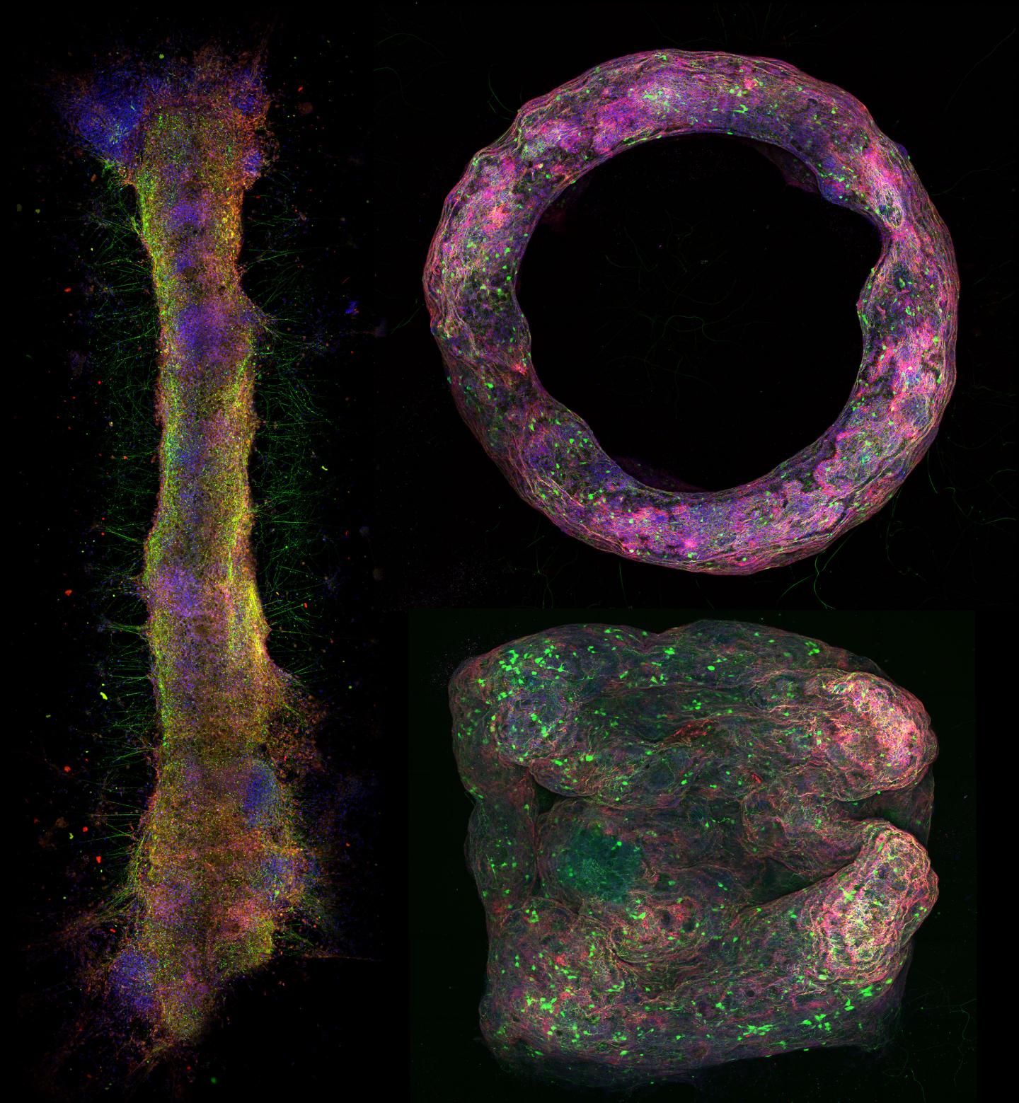 image: Different neural tissue geometries formed with the new biofabrication method and imaged using confocal microscopy