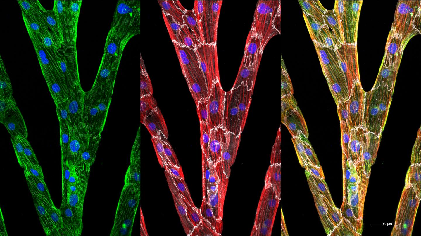 image: The three images show individual heart cells (outlined in white) that have elongated and aligned their internal cytoskeletal structure when grown in micropatterned lanes. The addition of bridges between lanes results in synchronized contraction over a large 2D area.