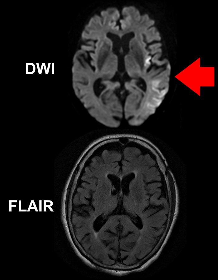 image: While a DWI MR image (top) of the brain of a stroke patient clearly shows areas of the brain impacted by the stroke (brighter areas indicated by red arrow), the FLAIR image below, taken at the same time, does not reveal obvious acute ischemic damage. The mismatch between the two images implies the patient was imaged within 4.5 hours of symptom onset.
