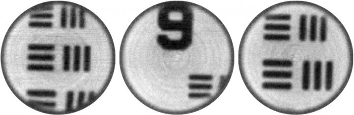 image: Once the key to unscrambling the images has been measured, it is possible to image through the optical fiber -- turning it into an ultra-thin endoscope. Shown are some experimentally measured images of a resolution target. Each image is one twentieth of a millimeter wide (about the same width as a strand of hair).