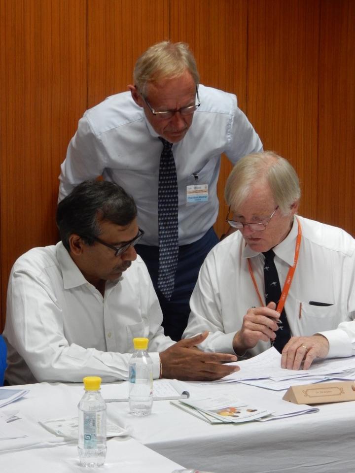 image: Karolinska Institutet researchers Björn Westrup (standing) and Nils Bergman (sitting, right) together with Dr Rajiv Bahl, Head of the Newborn Unit at WHO.