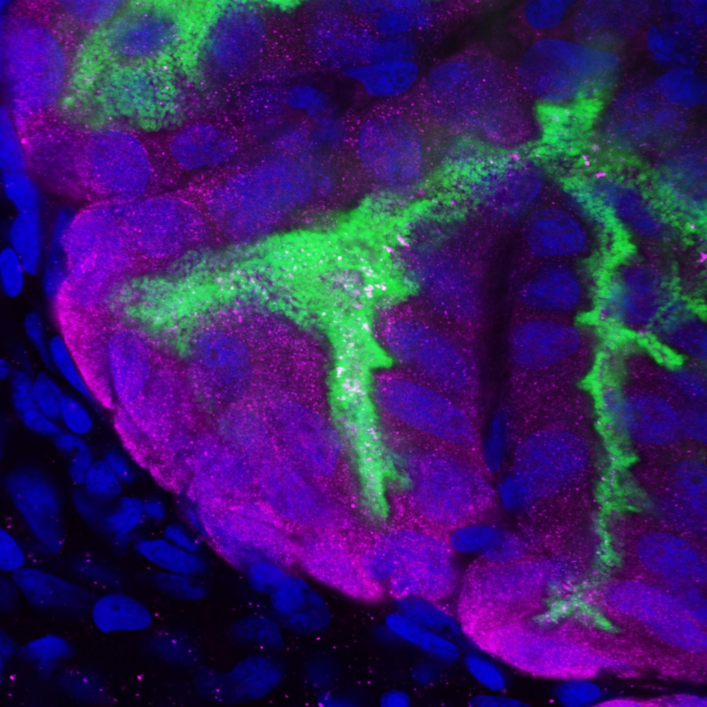 image: A 63x magnification image showing the 4-week-old light organ during the day showing EsMIF (magenta) surrounding the crypt spaces. Host DNA is labeled in blue and the bacteria are labeled in green.
