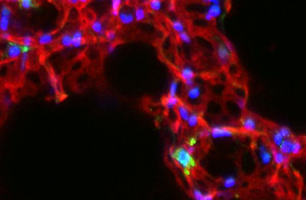 image: The frequency and activity of convential T cells serves as an early childhood immune signature that predicts the development of asthma later on. iNKT cells are shown in green, lung vasculature in red and cell nuclei in blue.