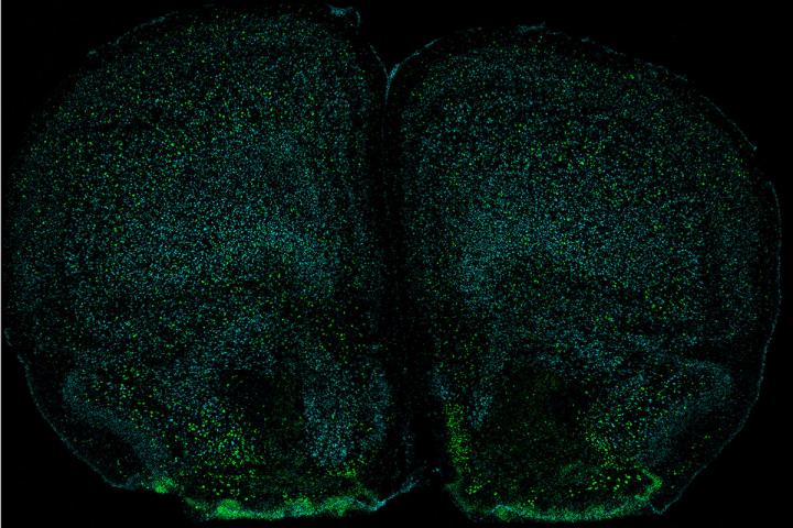 image: Neurons (green) in a mouse brain have a receptor (cyan) that detects the immune molecule IL-17. Researchers at Washington University School of Medicine in St. Louis have discovered that a molecule produced by the immune system acts on the brain to change the behavior of mice.