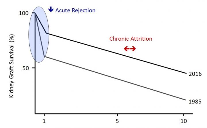 image: Medical advances have helped dramatically lower the rates of acute rejection (within the first year) after transplant but chronic rejection continues to reduce long-term organ survival.