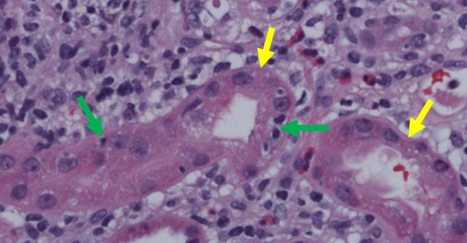 image: Microscopic image of kidney tubules (yellow arrows) under an immune attack (green arrows) characteristic of acute interstitial nephritis (AIN). Micrograph taken from a biopsy of a kidney cancer patient treated with immunotherapy who had a good response against the cancer.