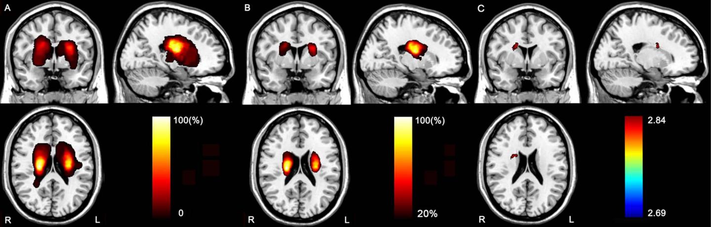 image: Stroke lesions. A, Lesion incidence map in patients with acute stroke. B, Lesion incidence map shows regions in which at least 10 patients had a lesion. Color bar denotes the probability of lesion distribution. C, Brain region that is correlated with attention deficit in the voxel-based lesion-symptom mapping (VLSM) analysis. Color bar denotes the t values.