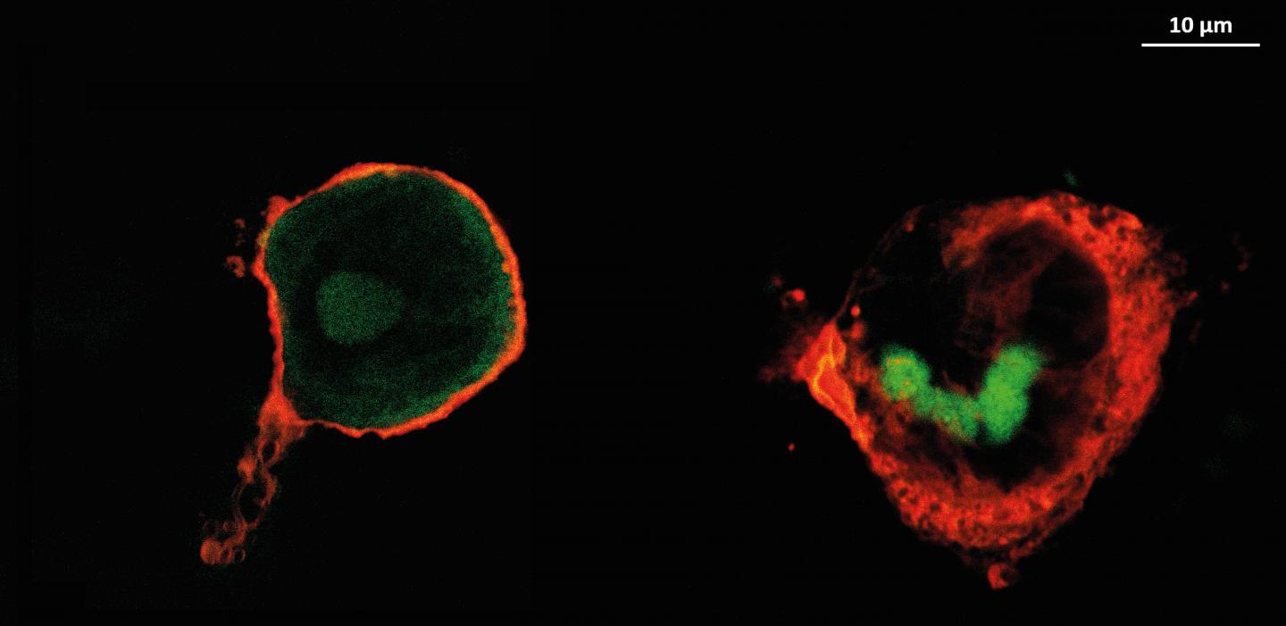 image: Images of macrophages (red) in which the active substance (green) is distributed. On the left, the active substance heparin is shown, on the right hyaluronic acid.