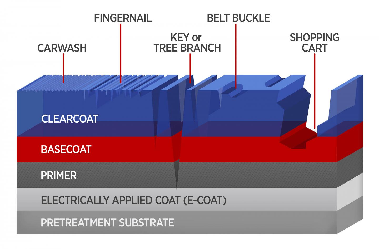 image: Schematic of the coating layers in a typical automobile composite body. Mar and scratch damages from a variety of object impacts are shown.