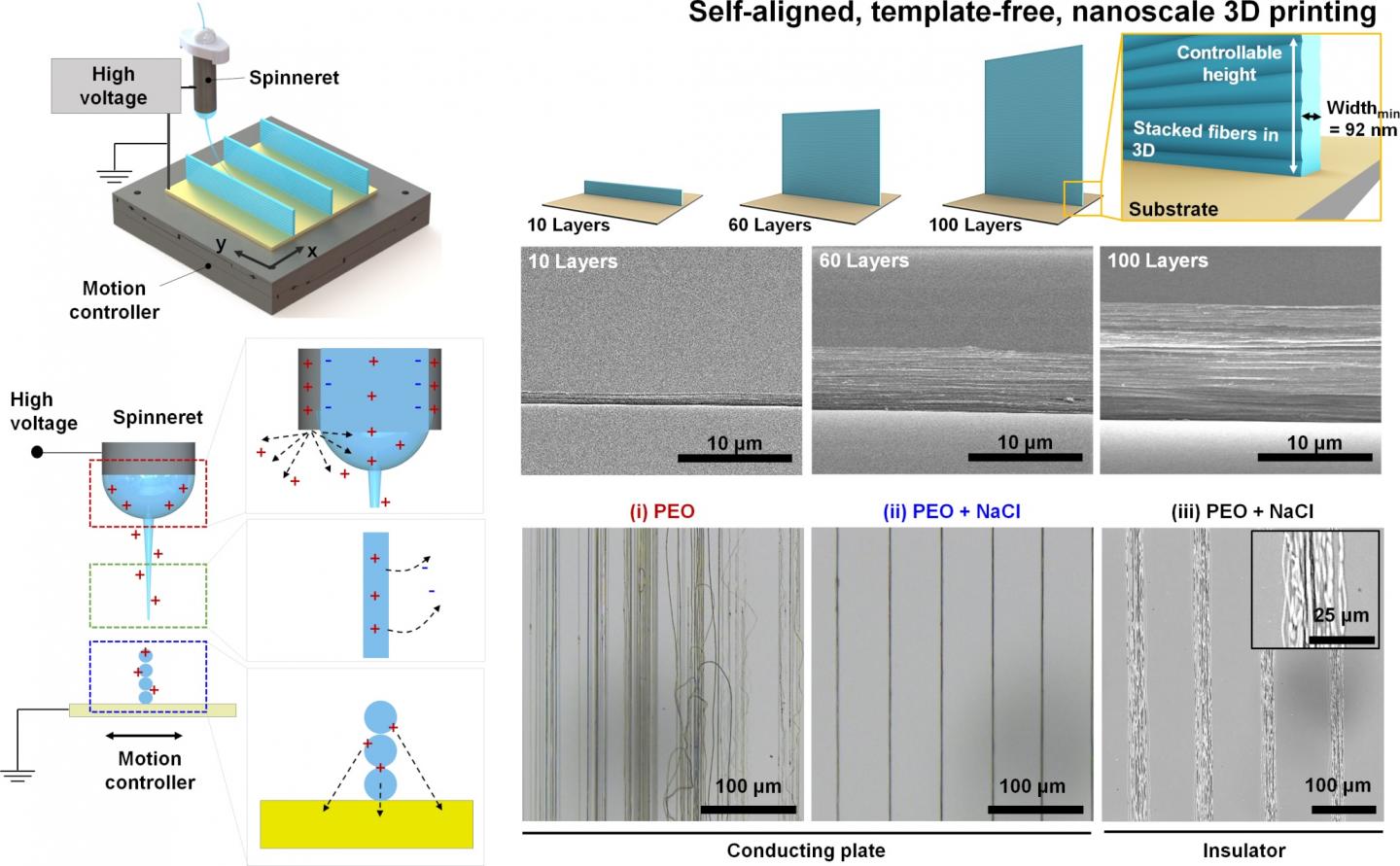 image: Near-field electrospinning (NFES) technique and charges. The IBS team achieved precise control of the layer-by-layer nanofiber deposition by just adding salt to the polymer solution. Optical images of the 3D printed nanofibers were prepared with solutions made of: (i) only polymer poly(ethylene oxide) (PEO), (ii) PEO and salt and using a conducting platform, and (iii) PEO and salt using an insulating platform. In (i), the nanostructure is not well aligned, because the deposited fibers have a weak positive surface charge, but adding salt increases the conductivity of the starting solution and the attraction between the nanofiber jet and the deposited fibers. An insulating plate made of silica reduced the effect, confirming the hypothesis. Thanks to this technique, IBS researchers constructed nanowalls with the desired height and number of layers.