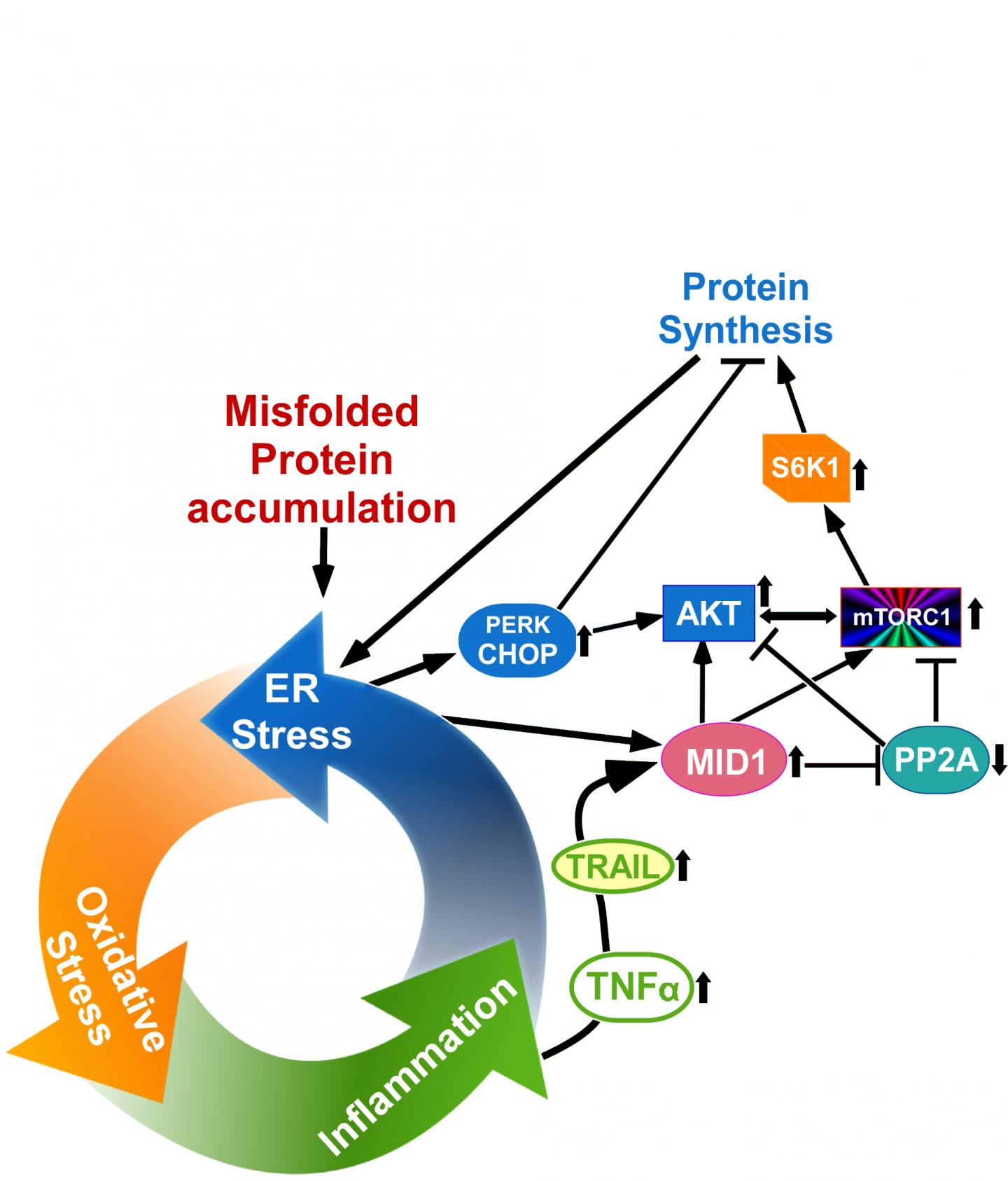 image: Misfolded protein accumulation stimulates endoplasmic reticulum (ER) stress, oxidative stress, and inflammation, creating a self-perpetuating cellular stress loop. Tumor necrosis factor (TNF)-α inflammation increases TNF-related apoptosis-inducing ligand (TRAIL) and midline 1 (MID1), which results in up-regulation of mammalian target of rapamycin complex 1 (mTORC1) signaling. mTORC1 signaling increases protein synthesis, which most likely exacerbates the stress on the already stressed ER. S6K1, protein S6 kinase beta-1; PERK, protein kinase-like endoplasmic reticulum kinase; CHOP, CCAAT/enhancer-binding protein homologous protein; AKT, protein kinase B; PP2A, protein phosphatase 2A.