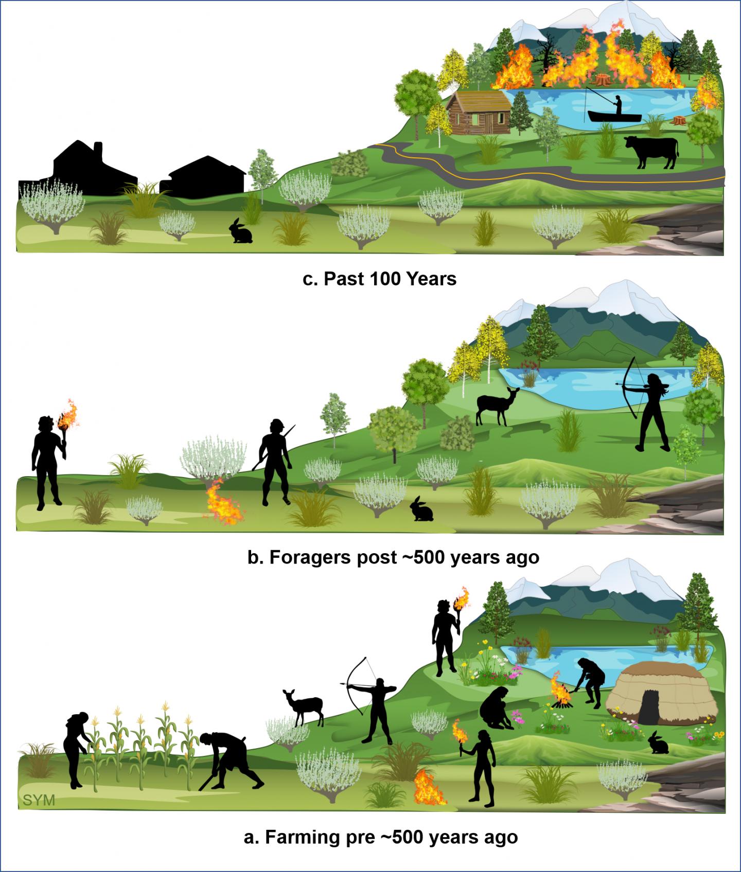 image: A schematic of what the authors think the landscape and human activity was like over the last 1,200 years in the Fish Lake Plateau region. A) 1,200 to 500 years ago, high density of people hunting, harvesting wild plants and cultivating crops. They controlled the fire regime with cultural burning that created a landscape dominated by the plants for sustenance rather than dense forest typical of the elevation. B) 500-100 years ago, farming activity ceased abrupt. Forgers and hunters still practiced cultural burning, although much less than farmers had previously. Trees began to slowly expand their range. C) Past 100 years, European settlers made cultural burning illegal, and the landscape became dominated by forests, setting up conditions for catastrophic wildfires.